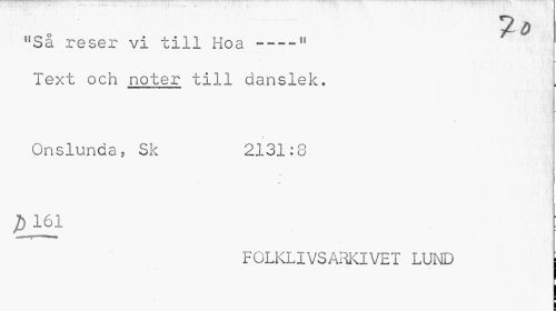 //// llSå reser vi till Hoa — Text och noter //// zl j- jL danslek, l //// Onslunda, Sk 2131:8 //// J) 161 //// 0 //// FOLKLIVSARKIVET LUND j ////