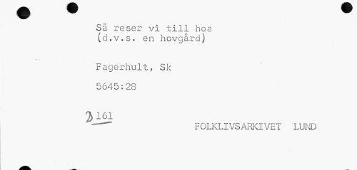 //// Så reser vi till hoa (d.v.s. en hovgård) //// % //// Fagerhult. Sk 5645:28 //// 3 161 //// ---FOLKLIVS ARKIVET LUND ////