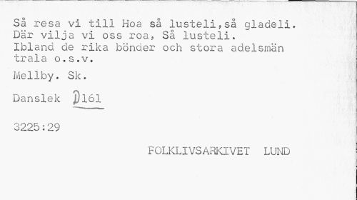 //// Så resa vi till Hoa så lusteli,så gladeli. Där vilja vi oss roa, Så lusteli. //// Ibland de rika bönder och stora adelsmän trala o.s.v. //// Me11by. Sk. Danslek $161 //// 3225:29 //// FOLKLIVSARKIVET LUND ////