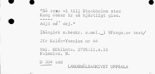 //// nSå resa vi till Stockholms stad Kung Oskar är så hjärtligt glad. //// Adjö me dej.11 //// (Sånglek m.beskr. o.mel._) 9Fragm.av text/ //// Jfr Kalén-Ysenius nr 44 //// Vml. Möklinta, 2795:11,s.16 Palmblad, W. //// D 304 add //// -~ LANDSMALSARKIVET UPPSALA ////