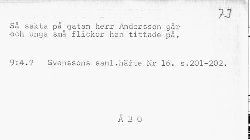 //// Så sakta på gatan herr Andersson går //// och unga små flickor han tittade på, - //// 9:4.? Svenssons saml.häfte Nr 16. s.201-202. //// i //// r //// ÅBO ////