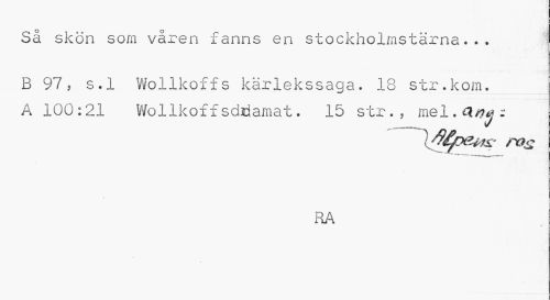 //// Så skön som våren fanns en stockholmstärna... //// B 97, s.l Wollkoffs kärlekssaga. 18 str.kom. //// A 100:21 Wollkoff sdtiamat. 15 str. , mel.a^r //// * "" --- //// I //// RA ////