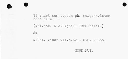 //// Så snart som tuppen på; morgonkvisten hörs gala. . . . //// (mel.not. K A.Rignell 1880-talet.) Sm //// Mskpt. Visor VII.s.621. E.U. 29865. //// NORD.MUS. ////