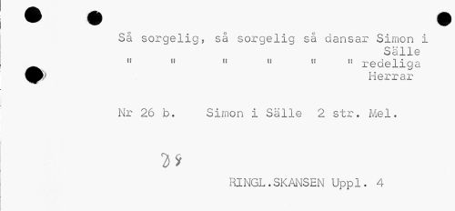 //// Så sorgelig, så sorgelig så dansar Simon i //// Sälle //// Ä ff n " n ,f " redeliga //// Herrar //// Nr 26 b. Simon i Sälle 2 str. Mel. //// 7)9 //// KENGL.SKANSEN Uppl. 4 ////