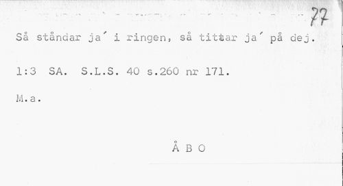 //// _ . « ^ n //// r ~ - ** " ¦ —• *"¦ r- rm t • ' * - » , : " ' • -r -r jr 9 //// Sä ståndar ja' i ringen5 så tittar ja' på dej. //// 1:3 SA. S.L.S. 40 s.260 nr 171. M. a. //// ÅBO ////