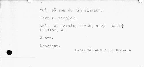 //// "Så, så som du mig älskar". Text t. ringlek. //// Små i. V. Torsås, 18568, s.29 (M 30^: Nilsson, A. //// 3 str. Danstext. //// ^ L ANDSMÅLS ARKIVE T UPPS ALA ////