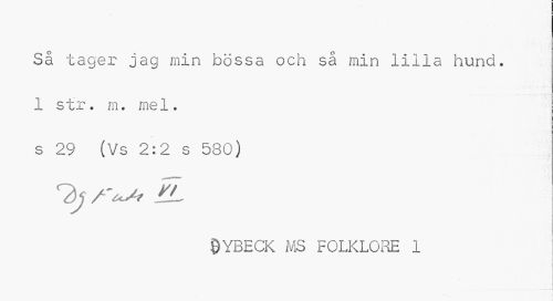 //// Så tager jag min bössa och så min liila hund. 1 str. m. mel. s 29 (Vs 2:2 s 580) //// ^ IL //// Dybeck ms folklore i ////