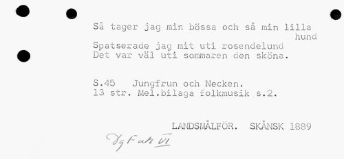 //// Så tager jag min bössa och så min lilla //// hund //// Spatserade jag mit uti rosendelund ^ Det var väl uti sommaren den sköna. //// S.45 Jungfrun och Necken. 13 str. Mel.bilaga folkmusik s.2. //// LANDSMALFÖR. SKÅNSK 1889 //// _ I/i ////