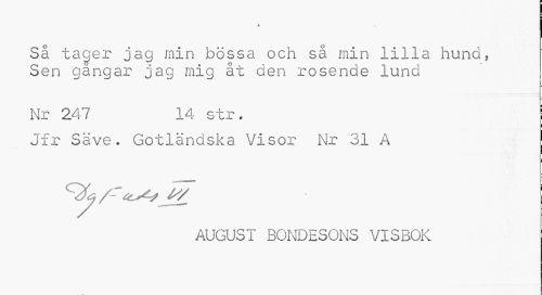//// i //// Så tagex^ jag min bössa och så min lilla hund, Sen gangar jag mig åt den rosende lund //// Nr 247 14 str. //// Jfr Säve. Gotländska Visor Nr 31 A //// i //// AUGUST BONDESONS VISBOK ////
