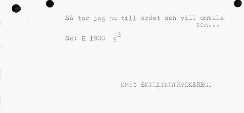 //// Så tar- jag nu till ordet och vill omtala //// ren... //// Se: E 1900 g^ //// KB:s SKILIINGTRYCKS REG. ////