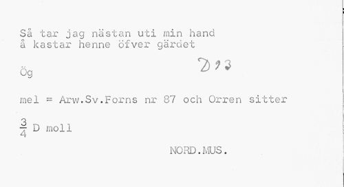 //// I //// Så tar jag nästan uti min hand //// å kastar henne öfver gäx^det ög ^ //// mel = Arvv.Sv.Forns nr 87 och Orren sitter | D moll //// NORD. MUS. ////
