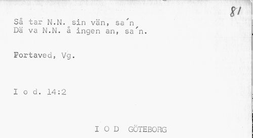 //// V //// Så tar N.N. sin vän, sa'n Dä va N.N. å ingen an? sa'n. //// ¦ ¦ > //// Fortaved* Vg. //// I o cl. 14:2 //// ¦ i //// I O D GÖTEBORG i ////