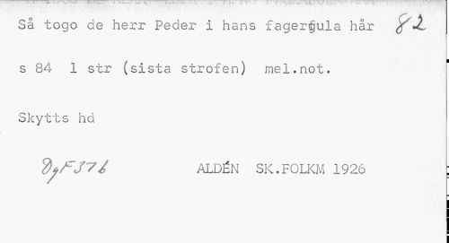 //// Så togo de herr Peder i hans fager^ula hår ^fX, //// : i //// s 84 1 str (sista strofen) mel.not. Skytts hd //// ALDÉN SK.FOLKM 1926 ; ////