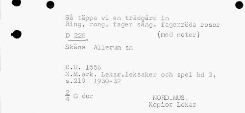 //// » //// Så täppa vi en trädgård in //// Ring, rong, fager sång, fagerröda rosor //// D 228 (med noter) //// « //// Skåne Allerum sn E.U. 1556 //// N.M.ark. Lekar,leksaker och spel bd 3, s.219 1930-32 //// 2 //// 4 G dur NORD.MUS, //// Kopior Lekar ////