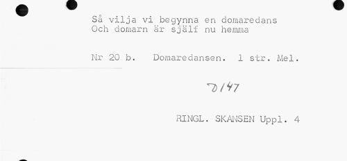 //// Så vilja vi begynna en domaredans Och domarn är själf nu hemma //// Nr 20 b. Domaredansen. 1 str. Mel. //// RINGL. SKANSEN Uppl. 4 ////
