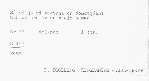//// Så vilja vi begynna en domaredans Och domarn är nu sjelf hemma T //// Nr 48 mel.not. 1 str. //// i //// I //// D 147 komm. //// i //// F. EGGELING RINGDANSÄR o.JUL-LEKAR ////