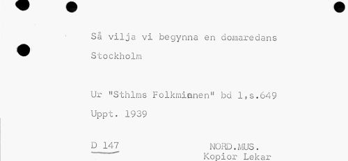 //// Sä vilja vi begynna en domaredans ^ Stockholm //// Ur "Sthlms Folkmianen11 bd l?s.649 Uppt. 1939 //// D_147 NORD.MUS. //// vKopior Lekar ////