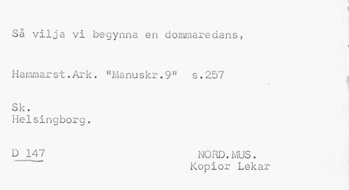 //// Sä vilja vi begynna en dommaredans, //// i //// Hammar st.Ark. "Manuskr*9U s.257 Sk. //// Helsingborg. //// D...147 NORD.MUS. //// Kopior Lekar ////