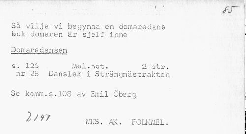 //// . v /J //// Så vilja vi begynna en domaredans feck domaren är sjelf inne //// Domaredansen //// s. 126 Mel.not. 2 str. //// nr 28 Danslek I Strängnästrakten //// Se komm.s.108 av Emil Öberg ; //// ^9/ MUS. AK. FOLKMEL. ////