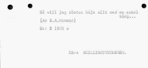 //// Så vill jag rösten höja allt med en enkel /. - , . sång. . . //// (Av S.A.Hammar) //// Se: H 1905 u //// KB:s SKILLINGTRYCKS REG. ////