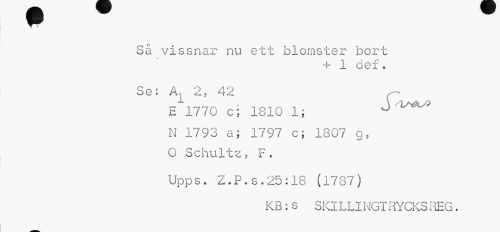 //// Så vissnar nu ett blomster bort //// + 1 def. //// Se: A, 2, 42 //// E 1770 c; 1810 1; ° //// N 1793 a; 1797 c; 1807 g, O Schultz, F. //// Upps. Z.P.s.25:18 (1737) //// KB:s SKILLINGTRYCKSREG. ////