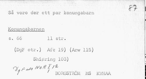 //// Sa voro der ett pa jc lc onungabarn [ //// B //// Konungabarnen //// s. 66 11 str. //// (DgF otr.) Af 2 19) (Arw 115) //// Shi0ring 103) " //// t ' BORGSTRÖM MS KVHAA ////