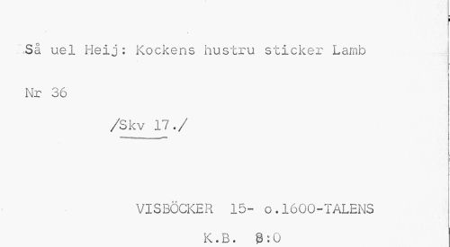 //// I //// Så uel Heij: Kockens hustru sticker Lamb Nr 36 //// /Skv 17./ //// VISBÖCKER 15- o.1600-TALENS //// K.B. 3:0 ////
