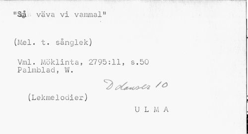 //// nSkgu> väva vi varnmal" (Me //// 1. t. sånglek) [ //// Vml. Möklinta, 2795:11, s.50 Palmblad, W. //// (Lekmelodier) ; //// U L M A ^ ////