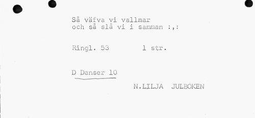 //// Så väfva vi vallmar //// och så slå vi i samman :,: //// Ringl. 53 1 str. //// D Danser 10 //// N.LILJA JULBOKEN ////