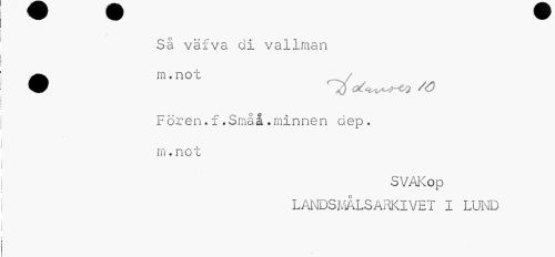 //// Så väfva di vallman //// •m.not //// O^^^O} /ö //// Fören.f.Småå.minnen dep. rn. not //// SVAKop LANDS MAL S ARKIVET I LUND ////