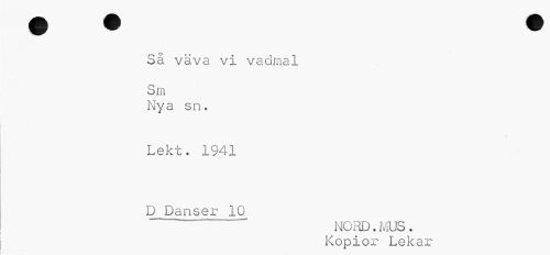 //// Så väva vi vadmal Sm //// Nya sn. Lekt. 1941 //// D Danser 10 //// NORD.MUS. Kopior Lekar ////