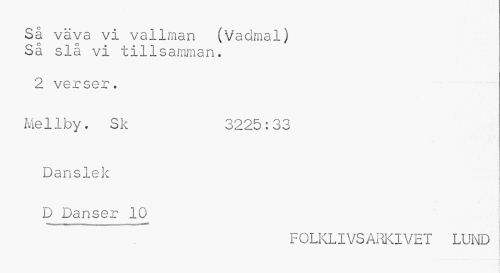//// Så väva vi vallman (Vadmal) Så slå vi tillsamman, //// 2 verser. Mellby. Sk 3225:33 //// Dansle le D Danser 10 //// FOLKLIVSARKIVET LUND //// i ////