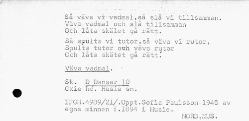 //// { \. =••' • . . j t, .. //// * ¦* " * ~ ~ "-«• • I**.. , //// . f »¦ J ' I» - //// Så väva vi vadmal,så slå vi tillsamman. Väva vadmal och sia tillsamman Och låta skälet gå rätt. //// Så spulta vi tutor,så väva vi rutor, Spulta tutor oxih väva rutor Och låta slcätet gä rätt T //// Väva vadmal. //// S k. D Danse r 10 ^ Oxie lidT Husie sn. //// IFGH.4989/21/.Uppt.Sofia Paulsson 1945 av egna minnen f.1894 i Husie. //// MO Rn. M _ ////