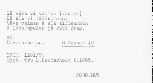 //// Så väva vi valman (vadmal) . //// Så slå vi tillsamman, Väva valman å slå tillsamman å låta jspolen gå rätt fram. //// i //// S. • ¦ //// ..O- I //// O.Rekarne sn. D Danser 10 : //// IFGH. 1181/9, //// Uppt. fru L.Landerholra f.1855. ! //// NORD.MUS ////