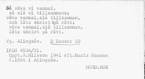 //// Så väva vi vammal, så slå vi tillsammans; //// väva vammal5slå tillsamman, och låta skelet kgå rätt; väva vammal,slå tillsamman, låta skelet gå rätt. //// Vg. Alingsås. D Danser 10 //// IFGH 4534/31. Uppt.R.Nilsson 1941 eft.Maria Hanson : //// f.1866 i Alingsås. //// NORD.MUS | ////