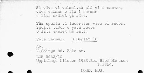 //// V • ? v - T r • ~ i - — ... //// Så väva vi valmal.så slå vi i samman, väva valman o si a i samman o låta skälet gå rätt. //// Så^ spulta vi tudor;sen väva vi rudor. Spulta tudor o väva rudor o låta skälet gå rätt. //// \ //// Väva vadmal. D Danser 10 Sk. //// ^^ V.Göinge hd. Röke sn. //// ^ LUF 5663/10 //// Uppt.Lage Nilsson 1938.Ber Elof Månsson //// f.1864. ////