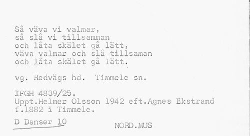 //// Så väva vi valmar, //// så slå vi tillsamman och låta skälet gå lätt, väva valmar och slå tillsaman och låta skälet gå lätt. //// vg. Redvägs hd. Timmele sn. //// IFGH 4839/25. //// Uppt.Helmer Olsson 1942 eft.Agnes Ekstrand f.1882 i Timrne1e. //// D Danser 10 .,TTC ___ NO RD. MUS ////