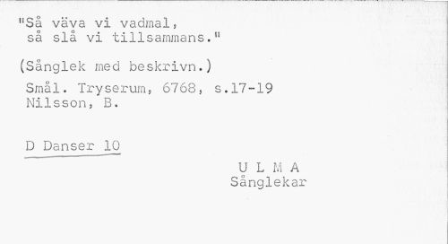 //// flSå väva vi vadmal? //// m //// så slå vi tillsammans." //// (Sånglek med beskrivn.) //// Smål. Tryserum, 6768, s.17-19 Nilsson, B* //// D Danser 10 //// U L M A Sånglekar ////
