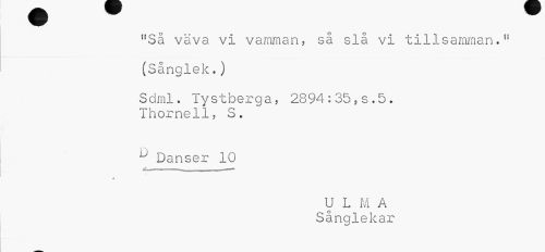 //// nSå väva vi vamman, så slå vi tillsamman.n (Sånglek.) //// Sdml. Tystberga, 2894:35,s.5. Thornell, S. //// u Danser 10 //// * //// U L M A Sanglel C 3 i? ////