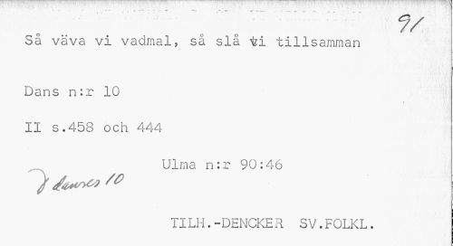 //// « t . ' f * --•' ¦•• • , »• «1 Så väva vi vadmal, så sia ti tillsamman //// Dans n:r 10 II s.458 och 444 //// Ulma n:r 90:46 TILH.-DENCKER SV.FOLKL. ////