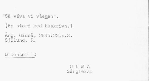 //// nSå väva vi våeman". //// ¦...U //// (En storf med beskrivn.) //// Ång. Gideå, 2845:22,s.8. Sjölund, R. //// D Danser 10 //// U L M A Sånglekar //// ... - • -...4 ////