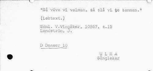 //// nSå väva vi valman, så slå vi samman.11 (Lektext.) //// Sdml. V.Vingåker, 10367, s.15 Lundström, J. //// D Danser 10 //// Ä U L M A //// ^r Sånglekar ////