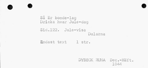 //// 0 //// Så är bonde-lag Dricka hvar Jule-dag //// Sid.122. Jule-visa //// Dalarna Endast text 1 str. //// DYBECK RUNA Dec.-Haft. //// 1844 ////