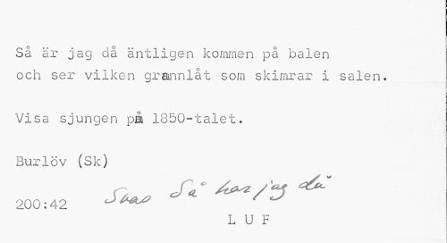 //// Så är jag då äntligen kommen på balen //// och ser vilken grannlåt som skimrar i salen» //// Visa sjungen på 1850-talet. //// Burlöv (Sk) //// 200:42 J<L ^ //// L U F //// i ////