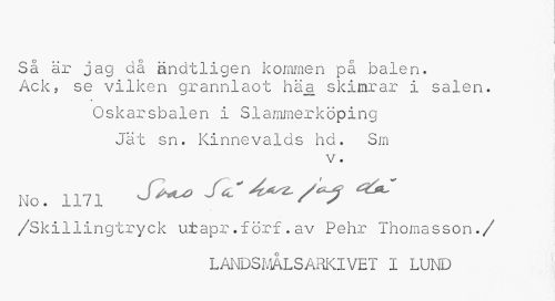 //// Sä är jag då ändtligen kommen på balen. Ack, se vilken grannlaot häa skimrar i salen. //// I //// Oskarsbalen i Slammerköping //// Jät sn. Kinnevalds ha. Sm //// v. //// No. 1171 //// /Skillingtryck utapr.förf.av Pehr Thomasson./ //// LANDSMÅLSARKIVET I LUND ////