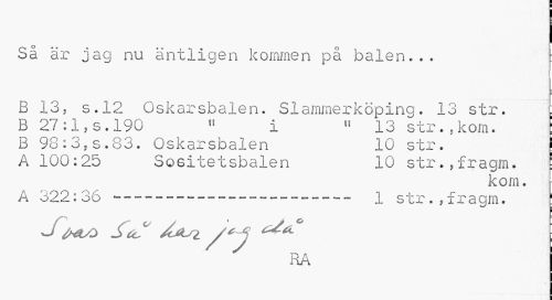 //// Så är jag nu äntligen kommen på balen... //// B 13. s.12 Oskarsbalen. Slammerköping. 13 str. //// B 27 :1, s. 190 11 i « 13 str., kom. j //// B 98:3,s.83. Oskarsbalen 10 str. ! //// A 100:25 So6itetsbalen 10 str.,fragm. ! //// kom. //// A 322:36 ---—--- 1 str.,fragm. ! //// J //// RA ////