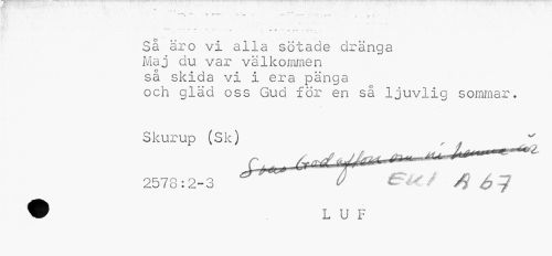 //// . v ' i • . . . « ¦¦ • • , » .v //// . - . > ^— r -r- —• .---• • - f , ^ -rt 4 ¦ //// Sa äro vi alla sötade dränga Maj du var välkommen så skida vi i era pänga //// och gläd oss Gud för en så ljuvlig sommar. Skurup (Sk) * //// 2578:2-3 /j ////