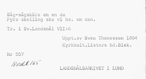 //// i //// Såg-sågskära om en da //// Fyra skelling ska vi ha, om dan, //// Tr. i Sv.Landsmål VII:6 //// f //// Uppt.av Sven Thomasson 1884 i //// | //// Kyrkhult,Listers hd.Blek. j //// Nr 557 //// v //// LANDSMALSARKIVET I LUND //// I « ////