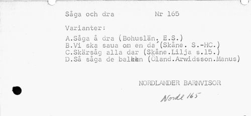 //// Såga och dra Nr 165 //// Varianter: //// A.Såga å dra (Bohuslän.^ E.S.) //// B.Vi ska saua om en da'(Skåne. S.-HC.) //// C.Skärsåg alla dar (Skåne.Lilja s.15.) //// D.Så såga de balkfen (Öland.Arwidsson.Manus) //// NORDLANDER BARNVISOR //// JlfinéU # ^ ////