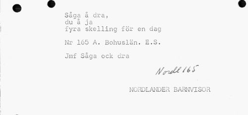 //// Såga å dra, du å ja //// fyra skelling för en dag Nr 165 A. Bohuslän- E.S. Jmf Såga ock dra //// NORDLANDER BARNVISOR ////